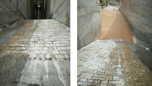 2018年3月,晶牛微晶集團(tuán)對四川省美姑河水電開發(fā)有限公司坪頭水電站3#泄洪閘下游斜坡段表層使用了60mm厚微晶產(chǎn)品裝備施工。該斜坡段表層之前用400mm硅粉混凝土進(jìn)行防護(hù),一個(gè)汛期后,硅粉混凝土抗沖磨層被完全破壞,下部結(jié)構(gòu)層鋼筋裸露,運(yùn)行單位對該部位進(jìn)行了等強(qiáng)同材質(zhì)修補(bǔ),一個(gè)汛期后修補(bǔ)層又被全部沖毀。2017年底,閘底板沖蝕深度達(dá)960mm,結(jié)構(gòu)破壞嚴(yán)重。使用微晶產(chǎn)品后,2018年6月,坪頭水電站3#泄洪閘下游斜坡段開始經(jīng)歷泄洪考驗(yàn),期間經(jīng)歷了1360小時(shí)泄洪,其中經(jīng)歷洪峰流量826m³/s。2018年10月30日泄洪完成后,經(jīng)現(xiàn)場確認(rèn),四耐微晶防護(hù)層整體完好,表面無磨損,試驗(yàn)結(jié)果超過預(yù)期。